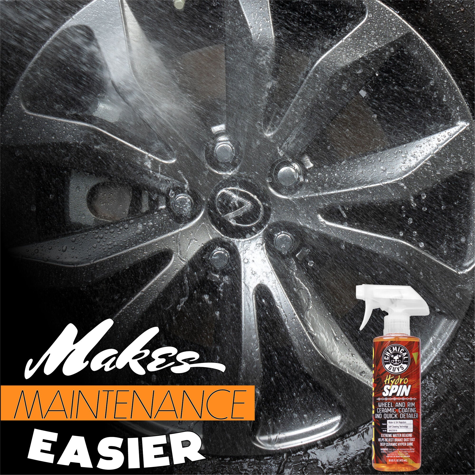 HydroSpin is an easy-to-apply. sprayable formula that provides a super-durable ceramic coating barrier for wheels and rims??protecting from dirt. brake dust. and contaminants with a brilliant. high-gloss shine and superior water beading.