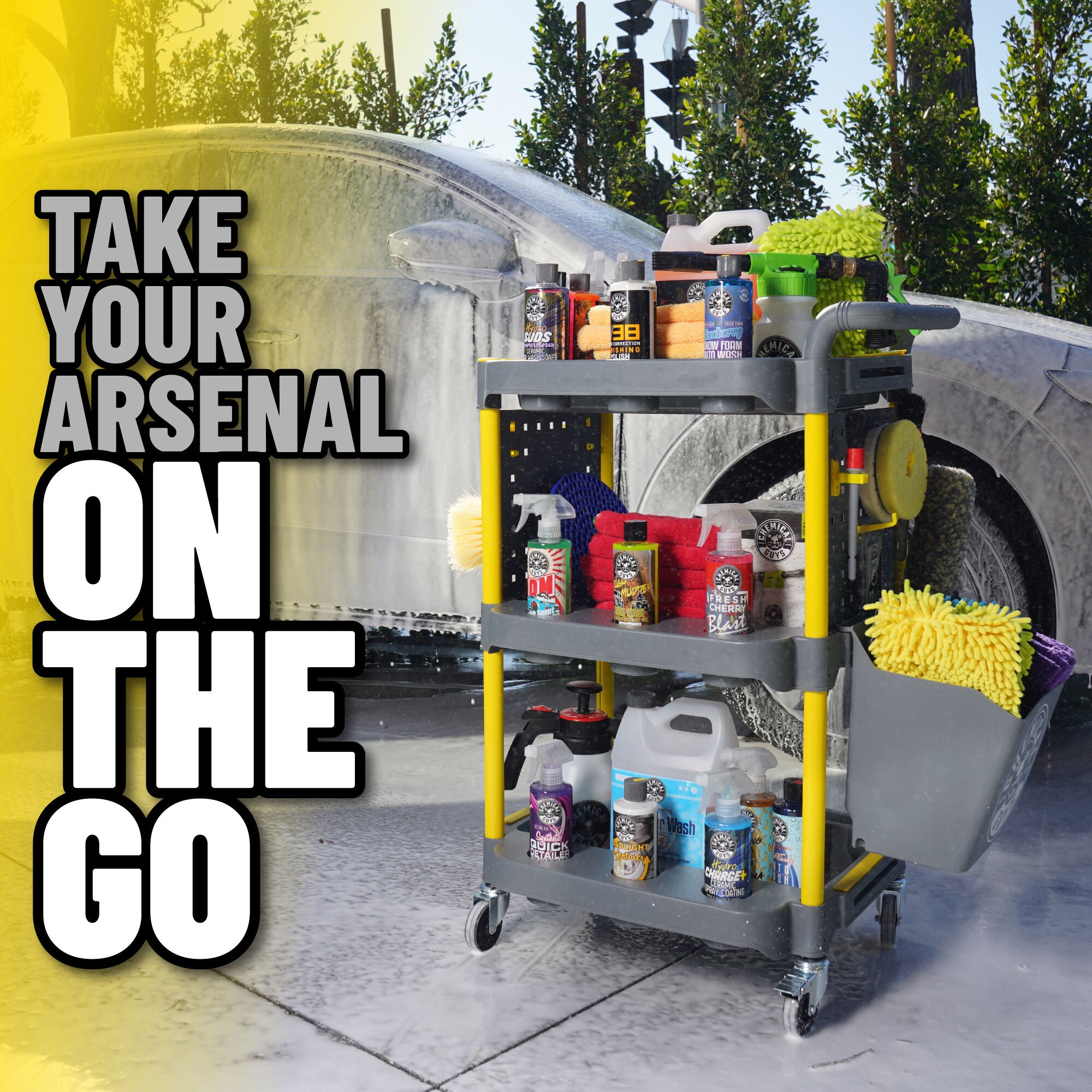 The Chemical Guys Shine Station Ultimate Detailing Cart is the customizable must-have rolling accessory to organize your detailing arsenal and take it on the go with three shelves. numerous bottle holders. hanging racks. and more.
